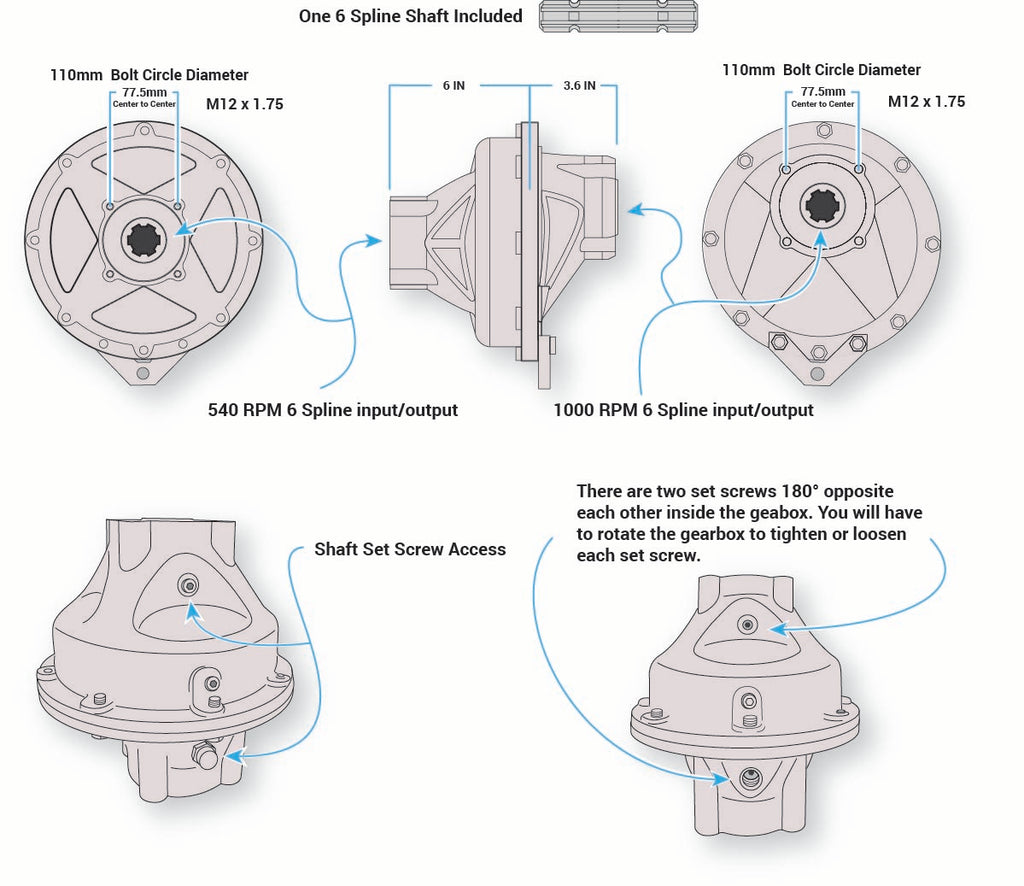 It comes ready to work with a 1-3/8" x 6-spline female input and a 1-3/8" x 6-spline output shaft, making it a versatile solution for a wide range of agricultural applications. Input and Output functions are reversible.
